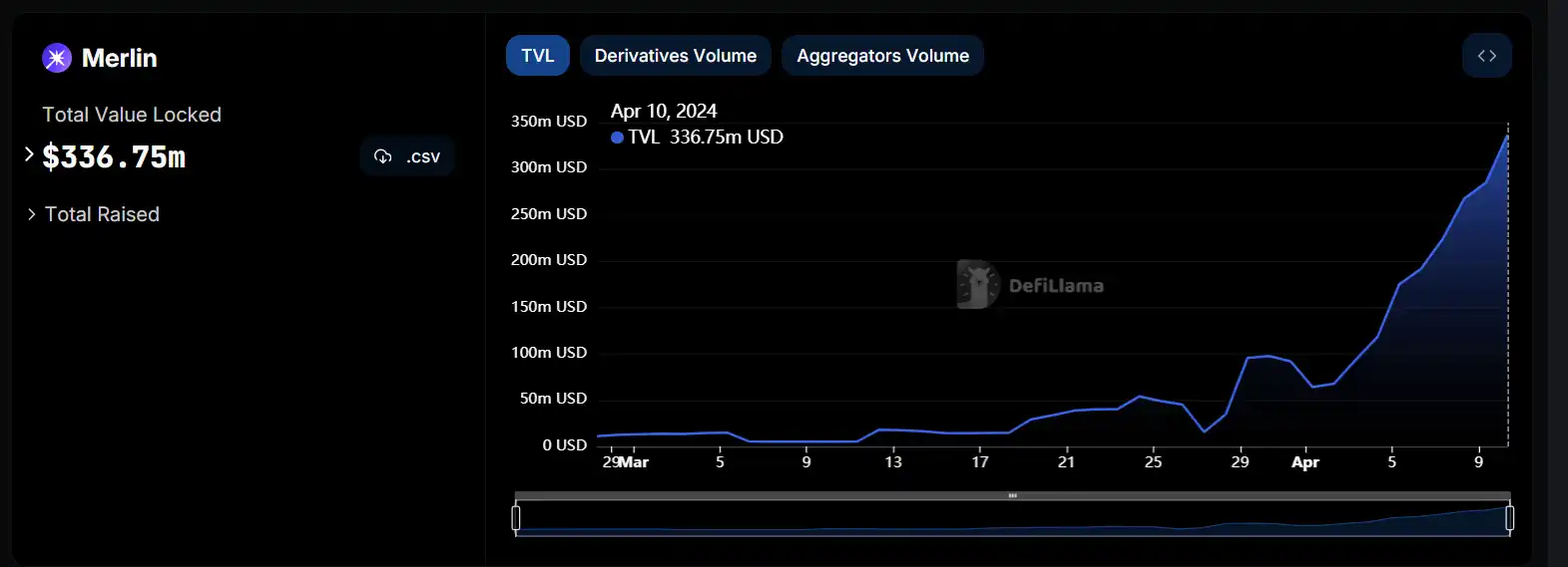 作为 BTC L2 的大热门专案,Merlin Chain 的 TVL 一直在增加,截止撰稿时已达到 3.3 亿美元。