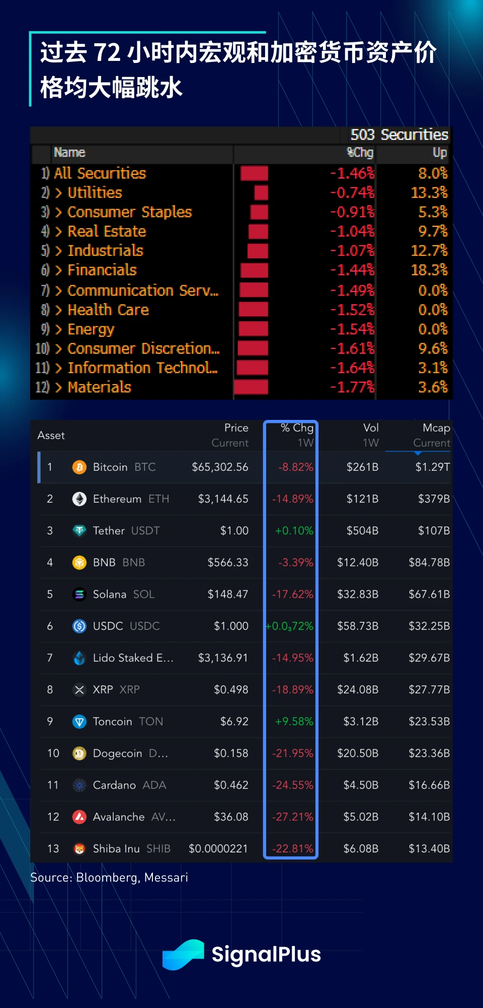 SPX 下跌 1.5% (92% 的成分股下跌,每个板块均呈跌势),美债和美元涌入避险买盘,加密货币则遭受了超过 10% 的亏损,BTC 在昨天从上周五的 6.9 万美元跳水至 5.9 万美元,之后收复了约一半的跌幅。