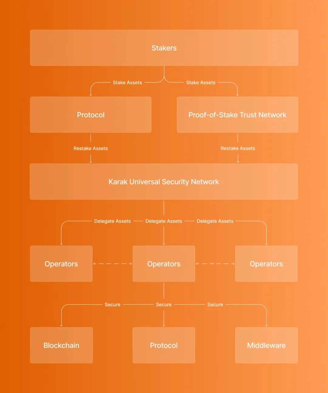 与 EigenLayer 类似,Karak 也有自己的 AVS 版本,叫做 Distributed Secure Services(分布式安全服务)。不同于 EigenLayer 仅局限于以太坊生态,Karak 引入了一个全新概念——为多种资产提供再质押的服务,支持任何人都在任何链上使用任何资产。