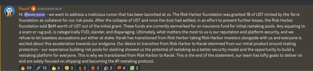 二是 Karak 团队前项目的“自保行为”遭到社区批评,更有 KOL 直指其为 RUG。针对这一质疑,团队在 4 月 9 日的 DC 中进行了回应。