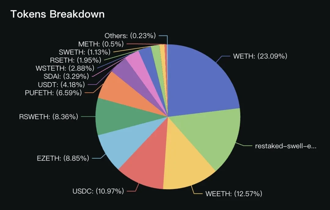 事实证明,Karak 这种方法是有效的。根据 DefiLlama 数据显示,以稳定币为例,Karak 再质押加密资产中稳定币约占 19% ,EigenLayer 再质押加密资产中稳定币也许不到 0.27% ,从以下饼图可以看出更多差异。