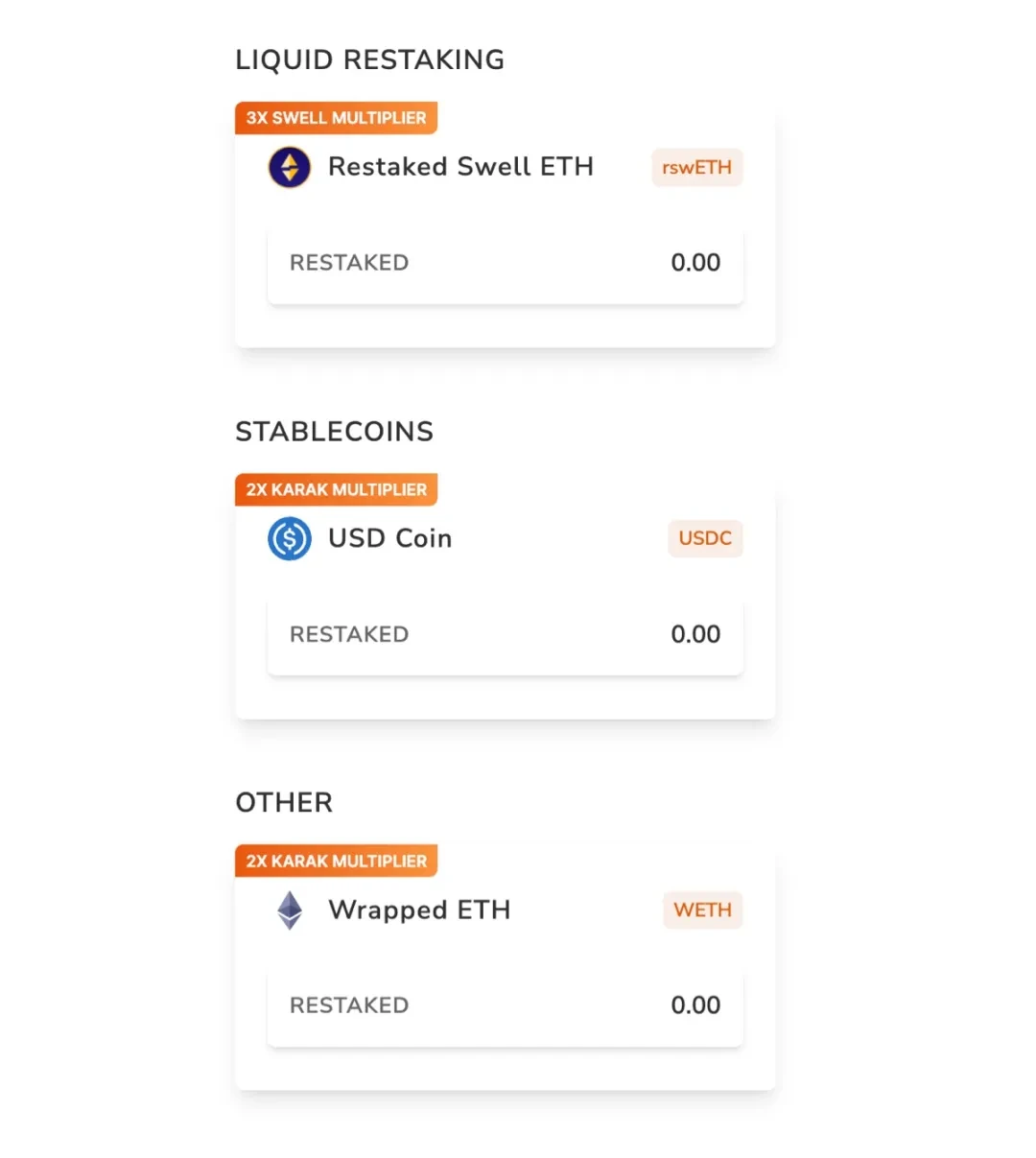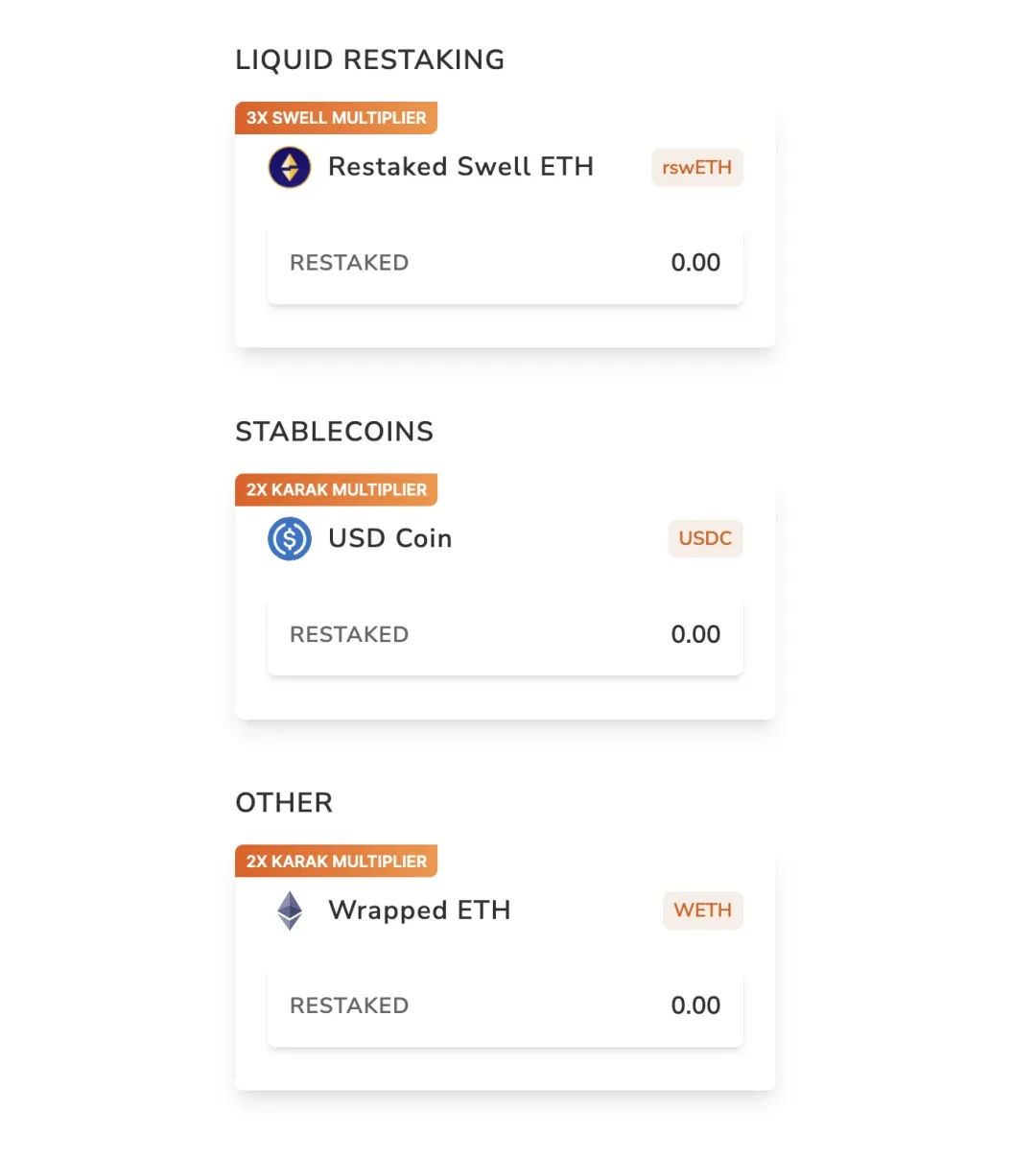 Karak 支持的质押资产:mETH 等多种 LST 资产,pufETH 等多种 LRT 资产,以及 USCT、USDC、sDAI 三种稳定币,注意不同网络支持的代币有所差异,请仔细确认。