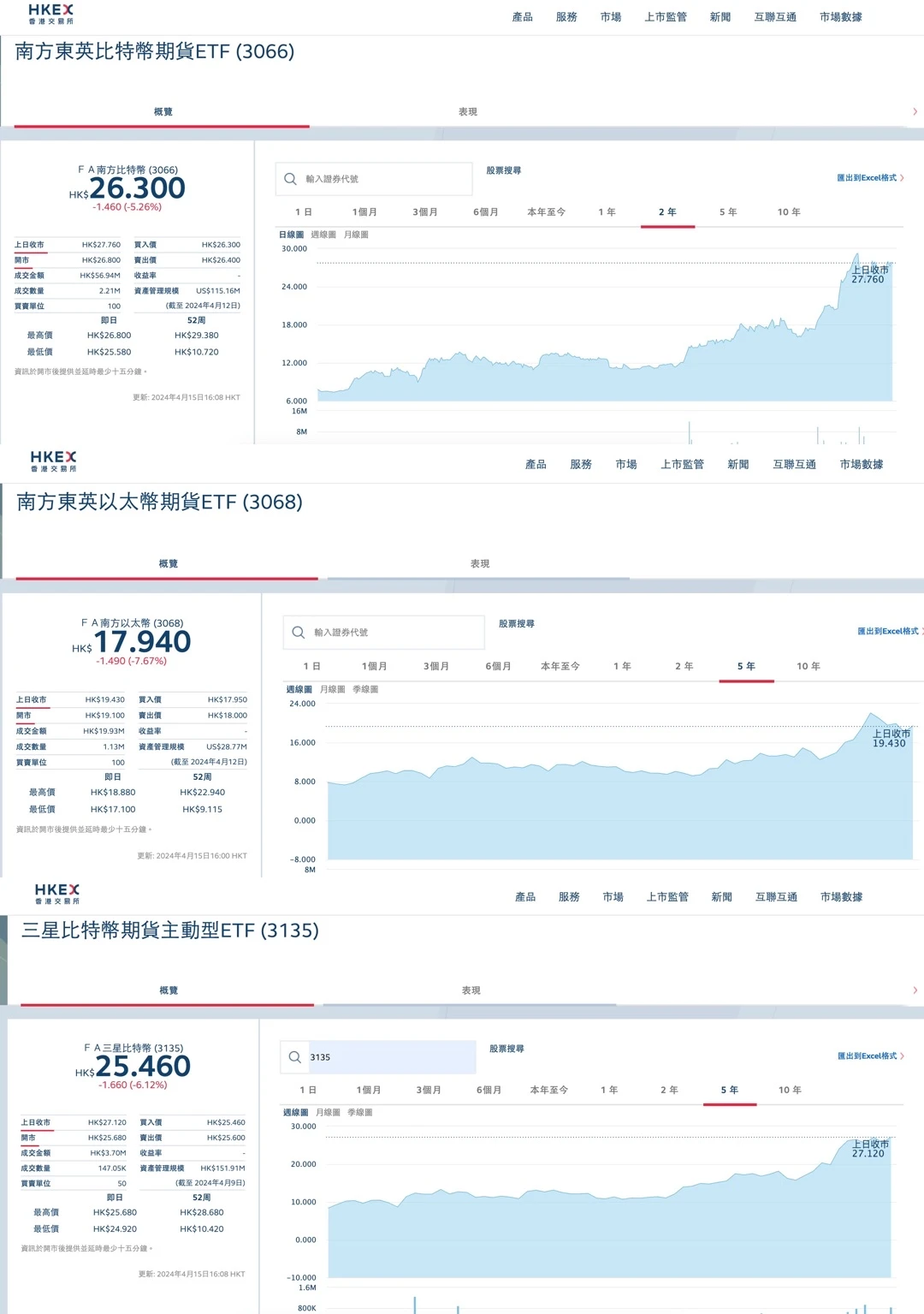 早在 2022 年 10 月,香港证监会就批准了基于期货的虚拟资产 ETF 发行。同年底,南方基金香港子公司南方东英正式在港推出亚洲首批加密货币 ETF:南方东英比特币期货 ETF、南方东英以太坊期货 ETF,港股市场成为亚洲首个可以为投资者直接提供比特币和以太坊期货 ETF 的资本市场。目前在香港上市的虚拟货币 ETF 共有 3 只,都为虚拟资产期货 ETF,主要由南方东英以及三星资产运用(香港)发行。