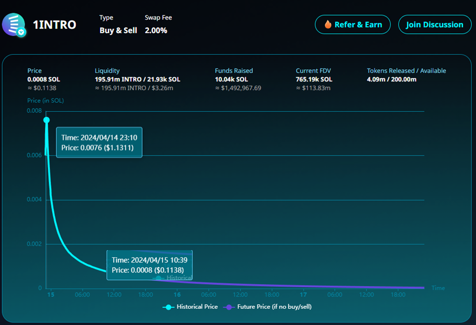 4 月 14 日晚上,号称 Solana 上第一个原生 LBP 项目的 1 intro,自己也通过 LBP 的方式开启了其代币 $ 1 INTRO 的发售。