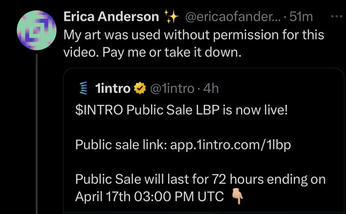 视频创作艺术家 Erica Anderson 表示 1 intro 官推在没有征求自己同意的情况下,宣传物料中盗用了自己创作的视频;