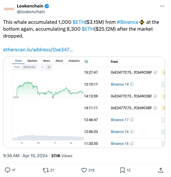 在此次价格下跌的过程中,数字货币的“巨鲸”们在 ETH 的低点大量买入建仓,例如一个以“0x E 34 ”开头的地址,选准了时机在最低点加仓了价值 3.15 $M 的 1000 个 ETH,整体仓位达到了 8300 ETH。