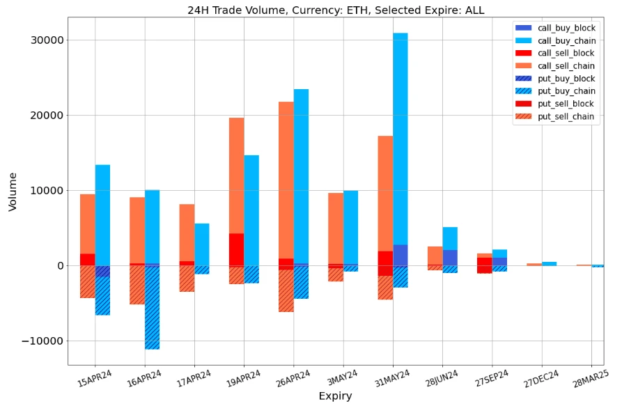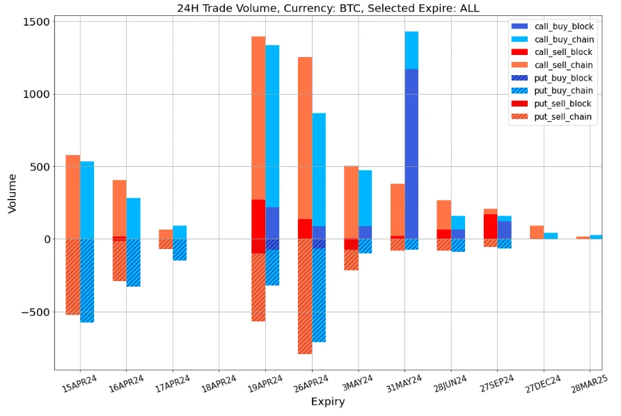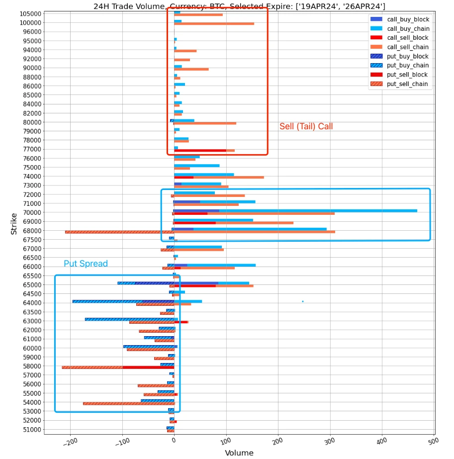 交易方面,BTC 在 19 APR 和 26 APR 出现数量可观的 Long Put Spread,或是对四月 18-20 号减半事件带来的波动作出进一步保护。另一方面,价格调整也吸引到了交易员进行逢低买入,特别是在五月底,以 Buy BTC 69000-C(850 BTC)和 ETH 3800-C(10542 ETH)为代表的看涨期权建仓成为市场焦点。