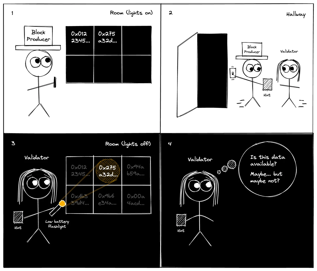 暗室中有一个公告板(请参见下面的漫画)。首先,区块生产者进入房间并有机会在公告板上写一些信息。当区块生产者退出时,它可以为验证者提供一小段信息(其大小不与原始数据线性缩放)。你带着手电筒进入房间,手电筒的光束非常窄,而且电池电量很低,所以你只能阅读布告栏上极少数不同位置上的文字。你的目标是让自己相信区块生产者确实在公告牌上留下了足够的信息,这样如果你打开灯并阅读完整的公告牌,你就能够恢复该文件。