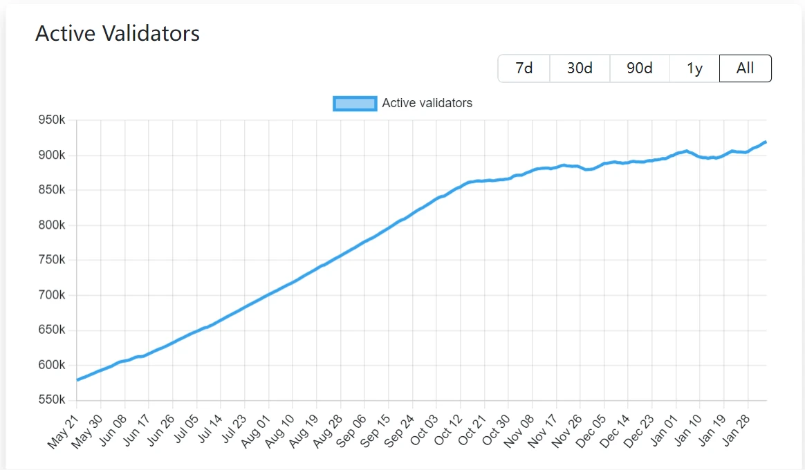 像一些传统的高性能 Layer 1 ,例如:Solana(验证者 1, 777)、Aptos(验证者 127),在验证者都不如以太坊节点数量(5, 000+)的情况下就开始追求可扩展性,代价就是对于节点的门槛要求高、运营成本贵;反观以太坊在大几十万验证者(目前 900 k+),确保了绝对的去中心化和安全性的情况下,才开始追求可扩展性,足以看出以太坊基金会对这两个特性的重视程度。