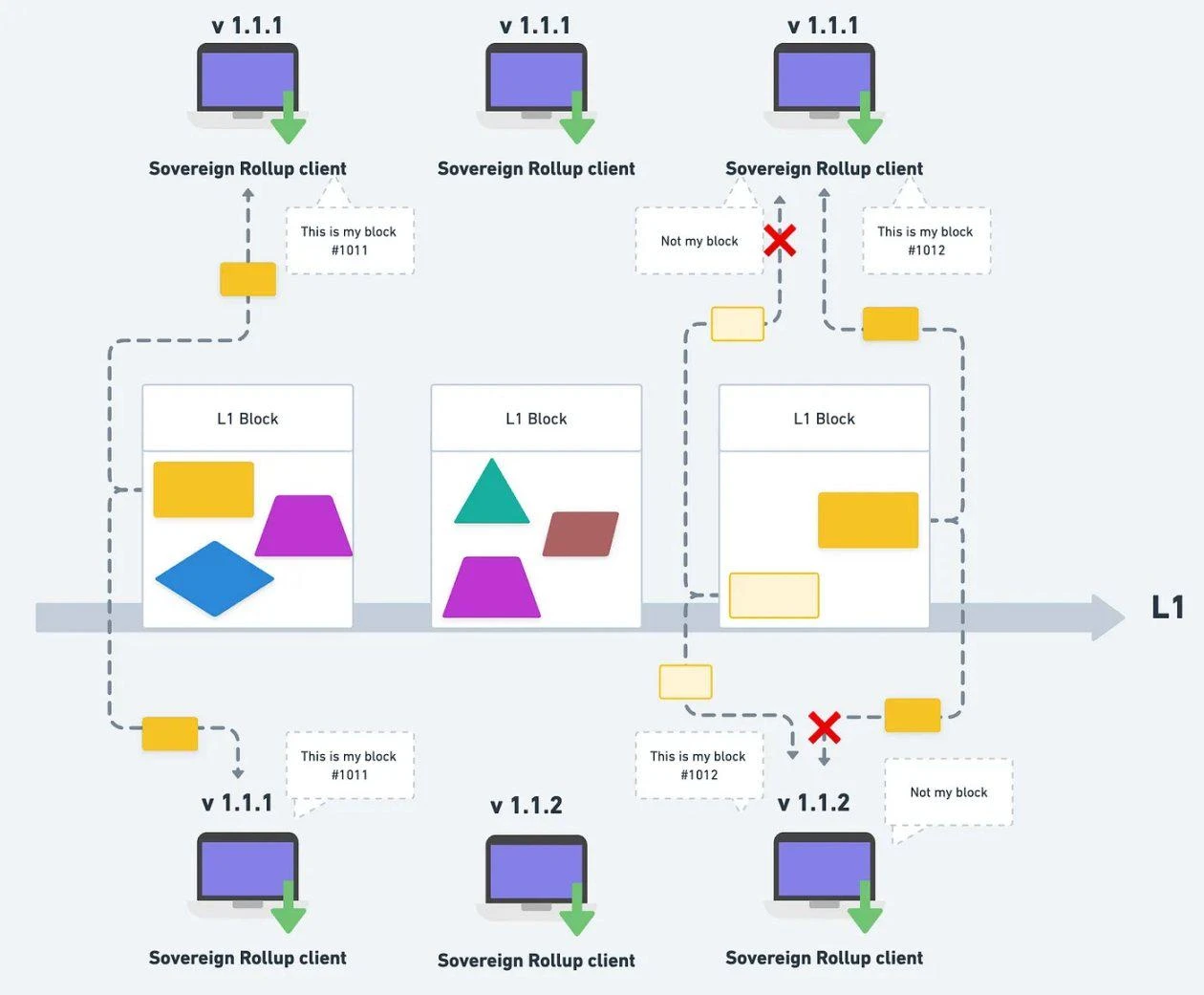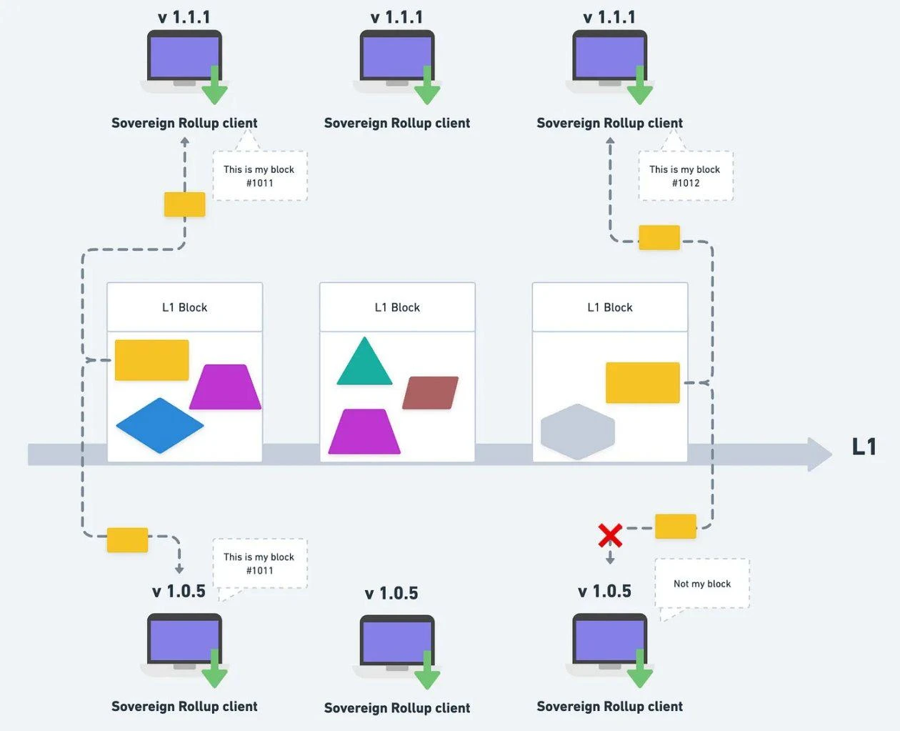 如果两个 Sovereign Rollup 的节点是不同版本,就可能会解读出不同资料、或是算出不同的最新状态,也因此这两个节点就不会在同一条链上,它们各自所看到的其实就是两条分岔的链的其中一条。(例如:以太坊硬分叉前和后成为了 ETC 和 ETH)