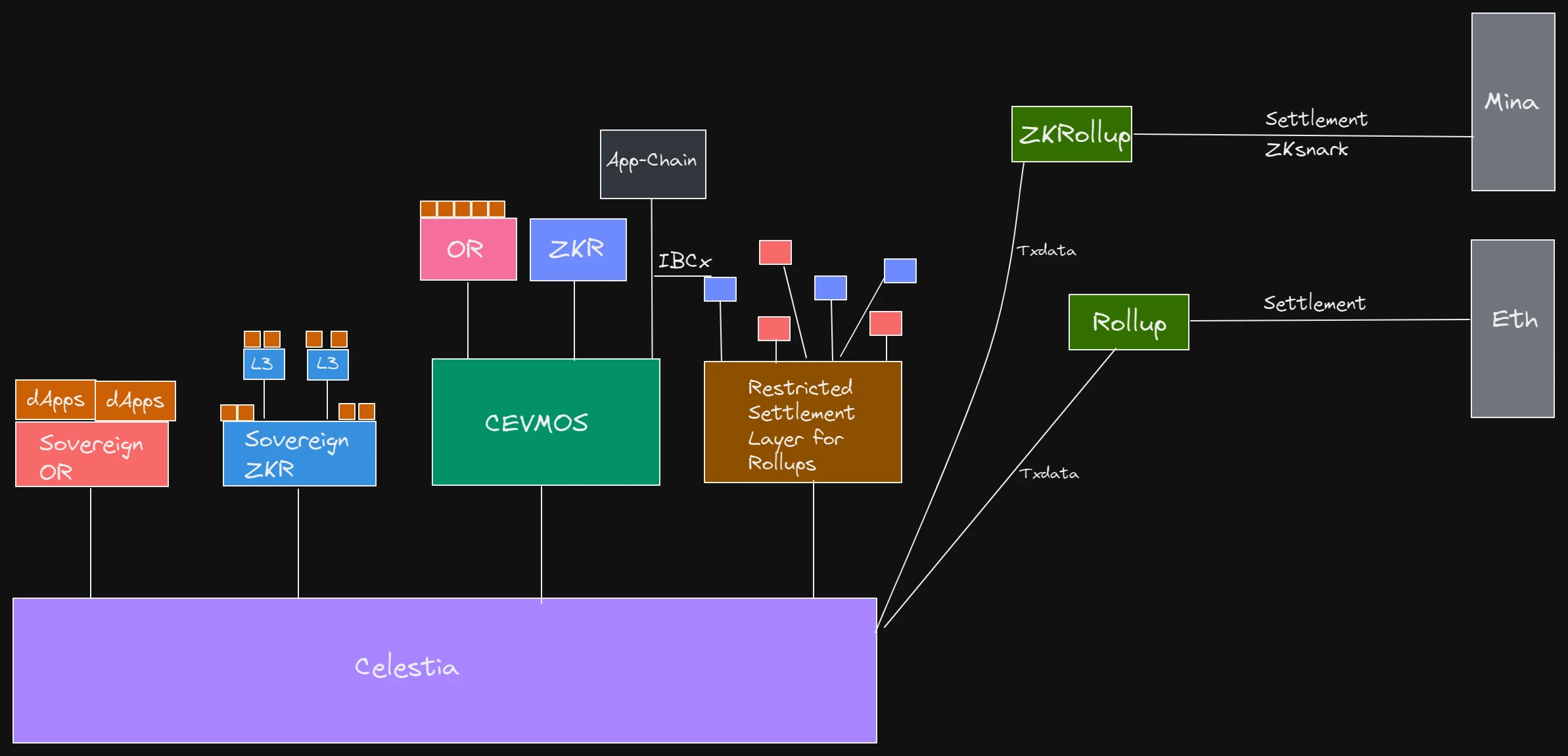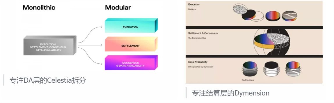 像 Celestia 是专注于数据可用性和共识层的 Layer 1 区块链;Optimism 和 Arbitrum 是专注于执行层的 Layer 2 区块链;Dymension 是专注于结算层。