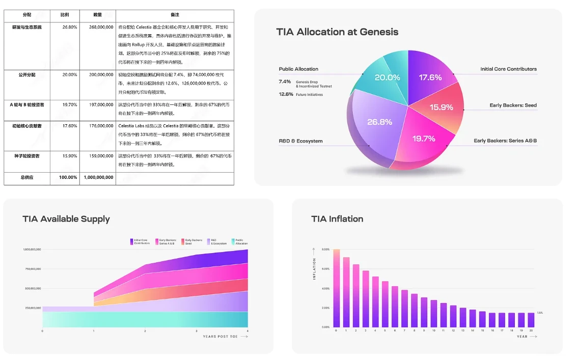 从代币经济学来看,Celestia 的代币分配投资人和团队将分得超过一半的代币,且这些代币当中的 33% 将在一年以后得以解锁。