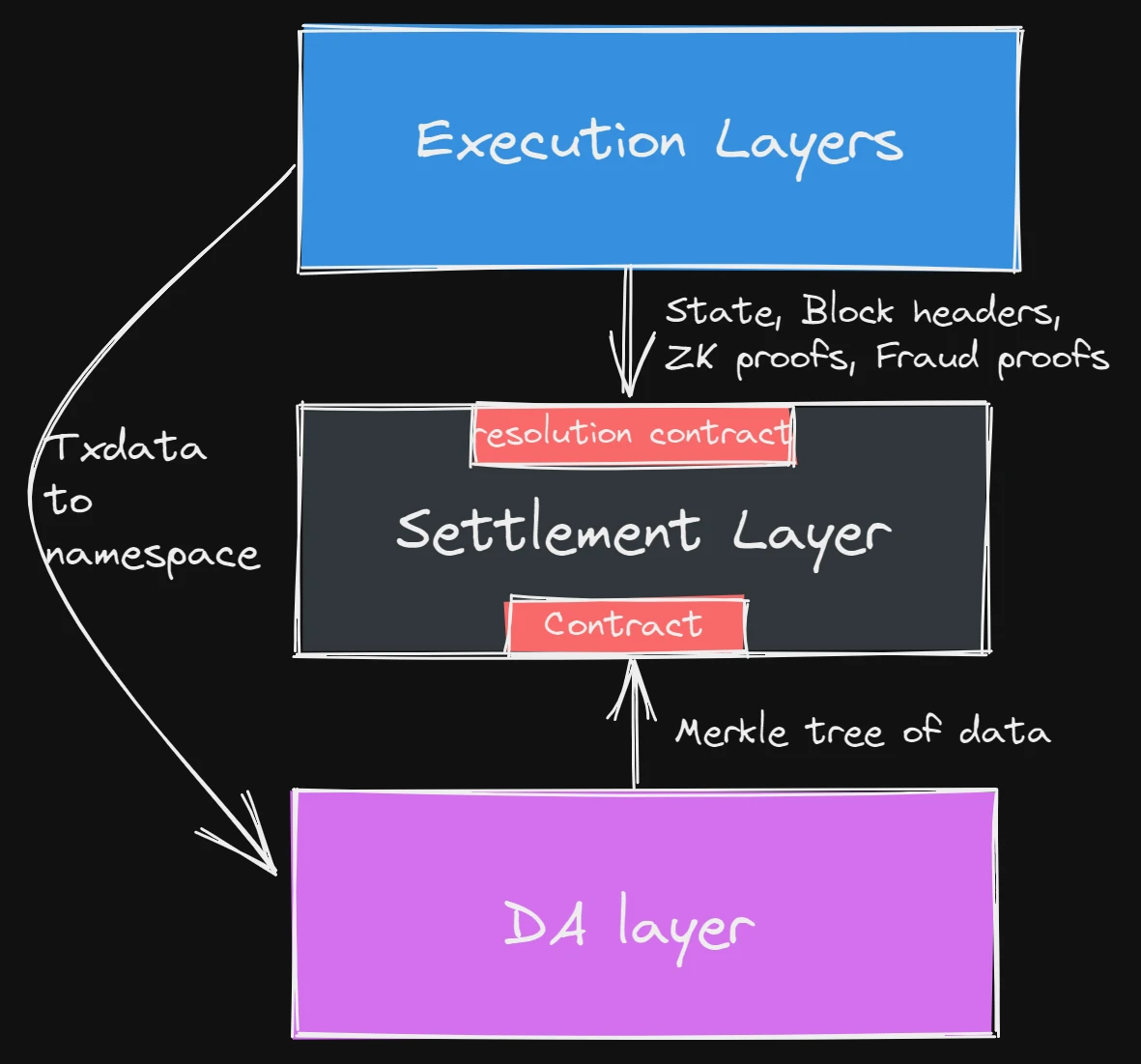 Celestia 属于第一个模块化区块链的解决方案,早期是作为一个执行层公链的存在,让智能合约在其上面执行。Rollup 的扩容解决方案进一步明确了执行层的概念,链下执行智能合约,将执行结果批量压缩成证明上传到执行层。