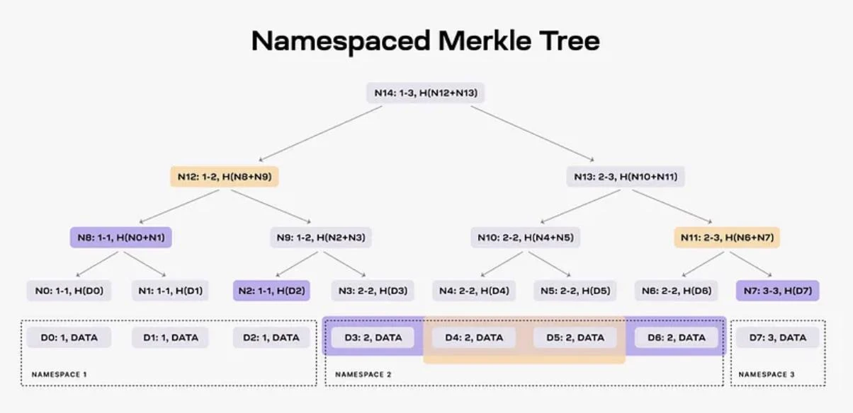 Celestia 将区块当中的数据划分为了多个命名空间,每个命名空间都对应着正在使用 Celestia 作为数据可用性层的执行层和结算层,这样每个执行层和结算层仅需下载和自己相关的数据就能够实现网络的功能。形象点说,就是 Celestia 为每个使用它作为底层的用户都建了一个单独文件夹,然后使用默克尔树来为这些用户做文件夹索引来帮助这些用户找到并且使用自己的文件。
