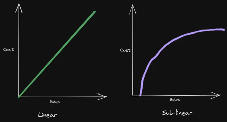 而 Celestia 的成本则是亚线性,成本最终会趋近于一个值,一个远低于以太坊现有成本的值。在 EIP-4844 升级部署后,Rollup 数据存储会从 Calldata 变为 Blob,费用降低,但仍旧比 Celestia 贵。