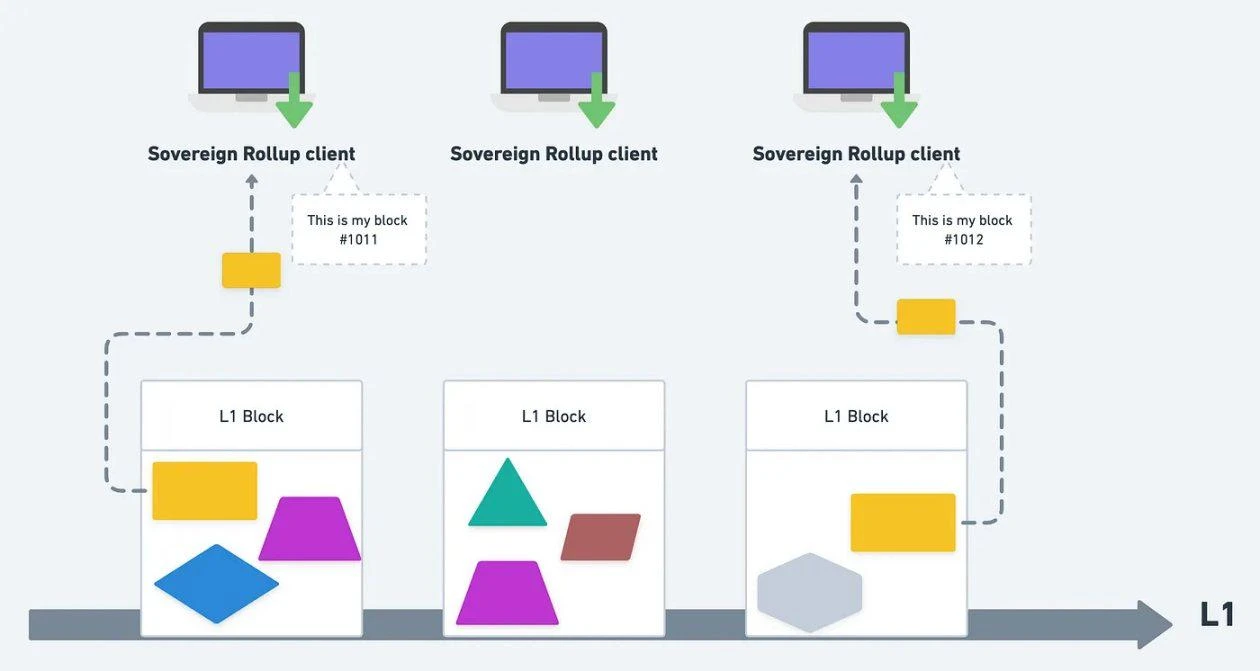 定义:只把材料上传到L1(把L1当作数据库)的 Rollup 叫做 Sovereign Rollup。换句话说,传统 Rollup 是只负责执行,结算、共识、数据可用性都交给L1,Sovereign Rollup 是组分执行、结算,将共识、数据可用性将给L1。