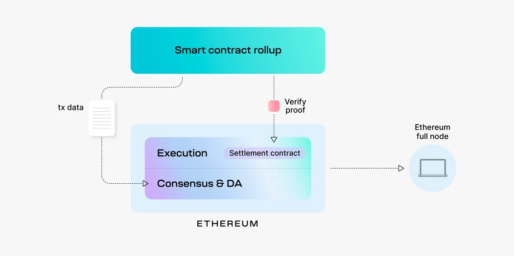 智能合约 rollup 依赖于在结算层的合约从而验。结算层上的智能合约成为了验证 smart contrct rollup 上新交易正确性的依据。