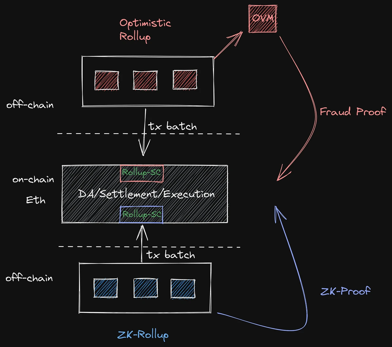 像 Arbitrum、Optimism、StarkNet 等 Layer 2 我们称之为智能合约 rollup,他们将所有的区块数据都发布到结算层(像以太坊),把L2的状态(L2各地址的余额)写到L1上。结算层的任务就是给区块排序、检查数据可用性、验证交易正确性。