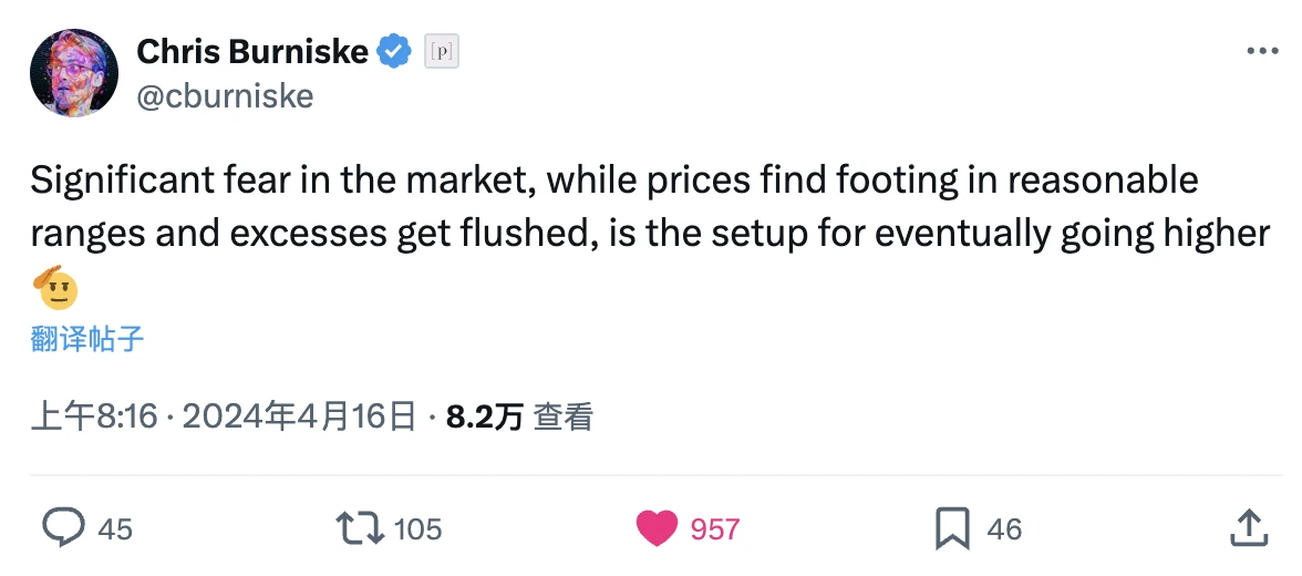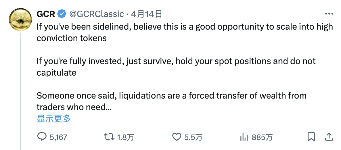 4 月 14 日凌晨暴跌之后,许久未曾在社交媒体上发布过交易言论的传奇交易员 GCR(曾顶部做空 DOGE、SHIBA、LUNA)公开喊多,该动态在 X 上现已有了近 900 万阅读,点赞数亦高达 5.5 万次。