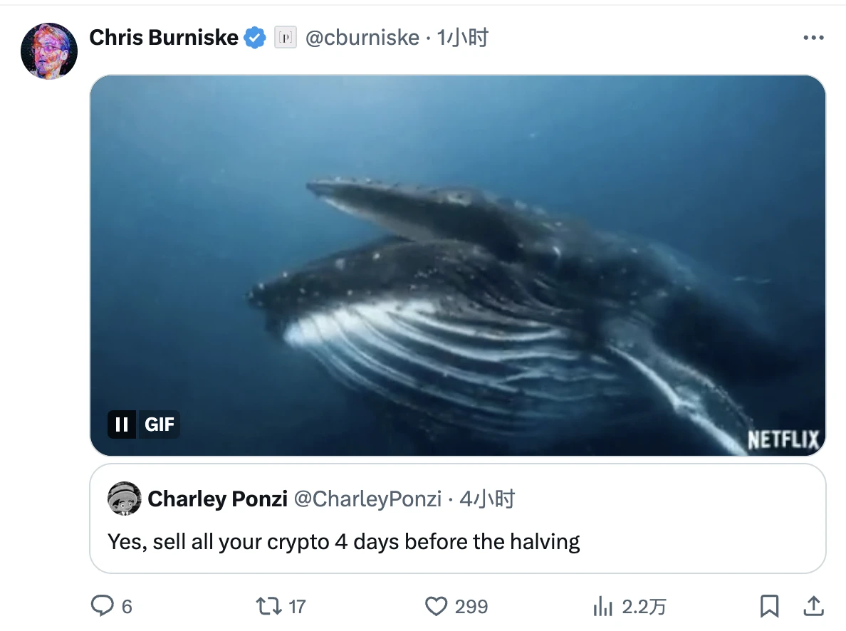 之后,Burniske 还转发了一则关于“你们居然会在减半前 4 天清仓”的动态,并配以鲸鱼吞食的图片,或暗指巨鲸正在低价吃掉散户恐慌抛售的筹码。