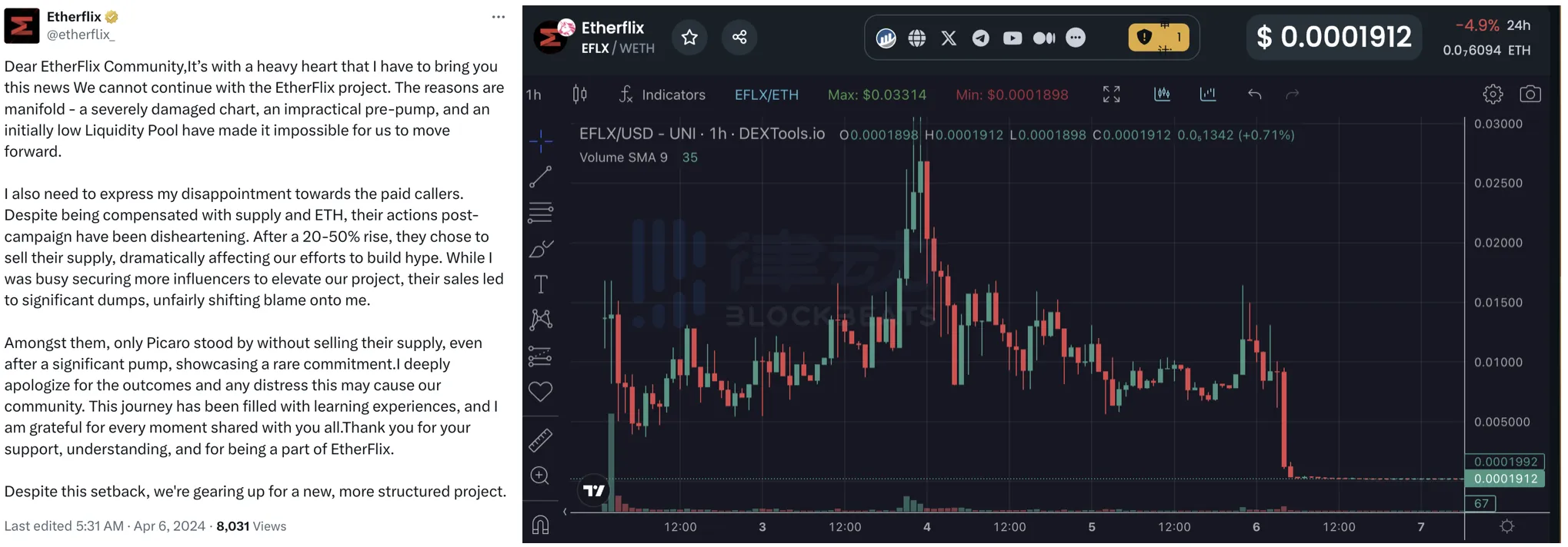 两周前,另一个 AI 流媒体项目 EtherFlix 也在它的「跑路宣言」中将 KOL 抛售代币作为支撑不下去的理由。
