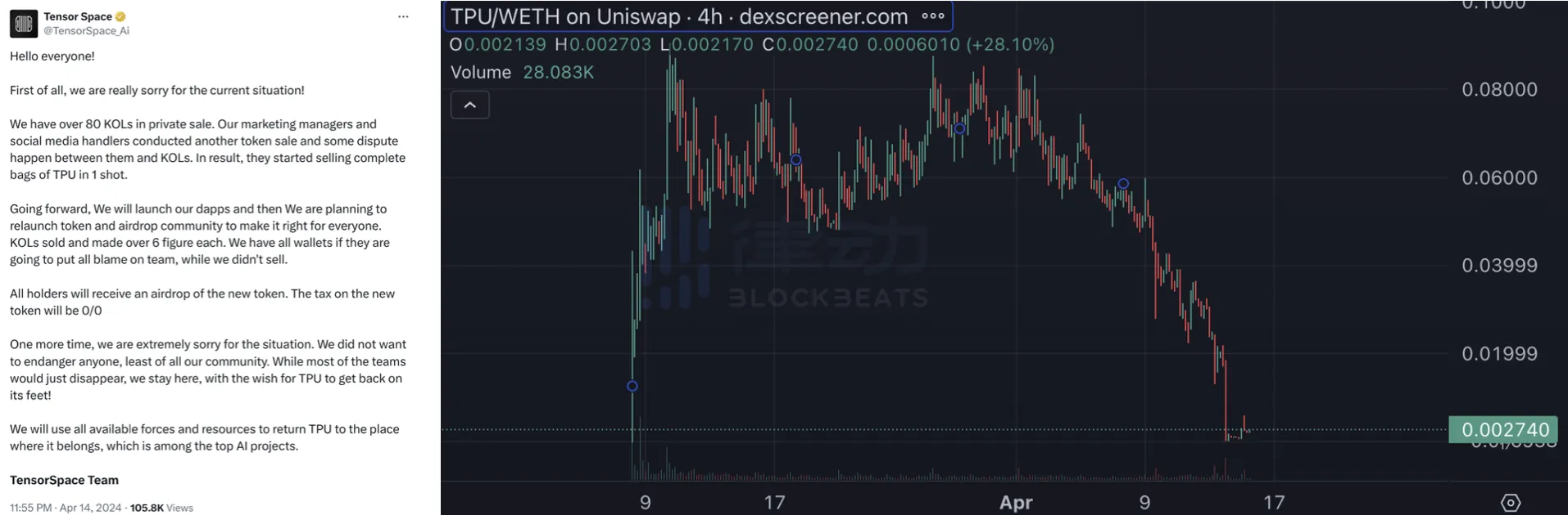 这条推文写道:「有超过 80 位 KOL 参与了我们的代币私募。我们的市场经理和社交媒体管理员近期进行了另一次代币销售,但在这个过程中,他们和 KOL 之间发生了一些纠纷。结果,这些 KOL 开始一次性抛售大量的 TPU 代币。」