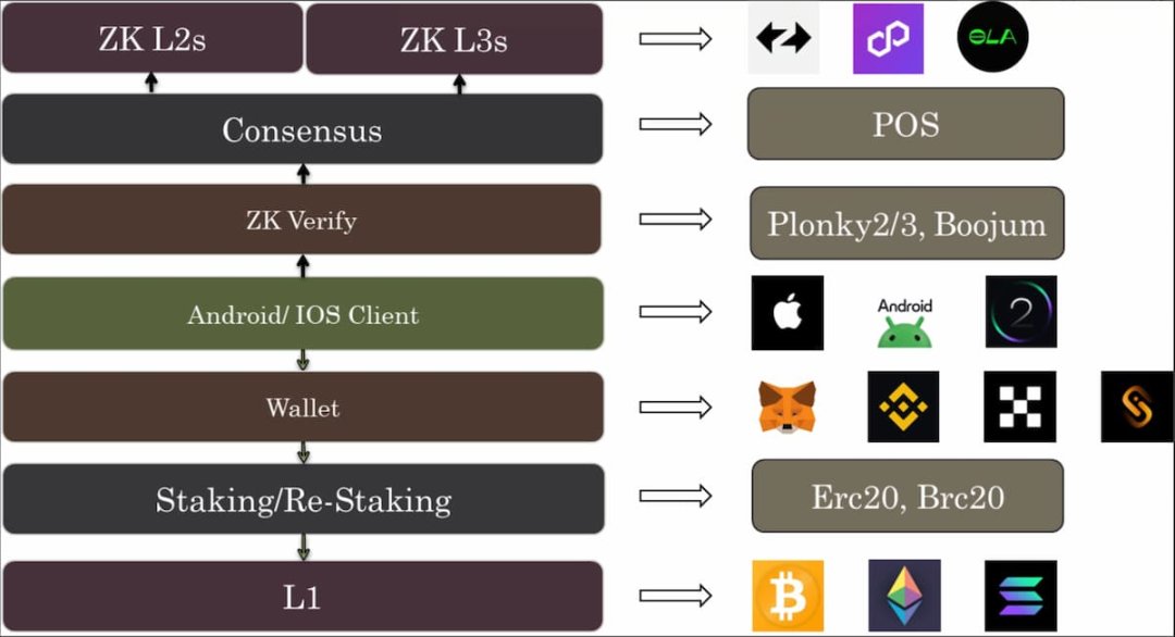 ola 是一个利用 ZKVM+DePin+AI 的二层 ZK 可编程隐私及扩容项目。Massive 的出现使得区块链模块化的设计分为:ZKRollup(链下计算)、DA(链下交易存储)、ZKVaaS(链下验证)、L1(状态更新),架构层如下所示: