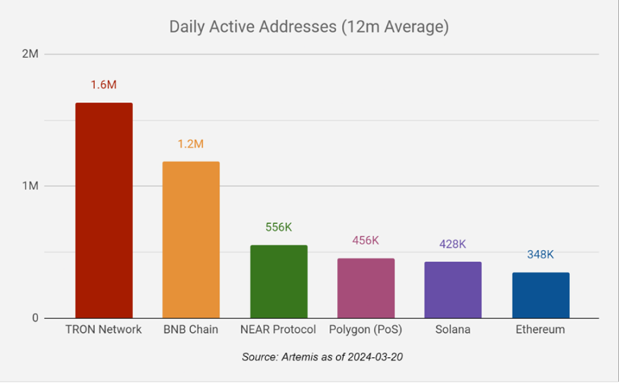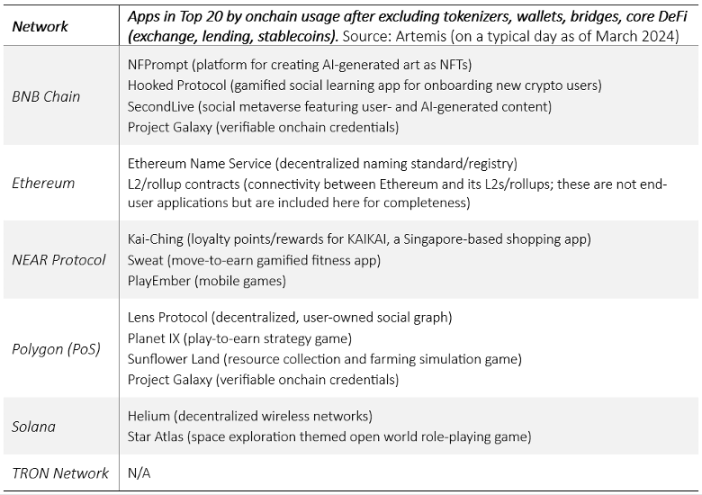 这 6 个网络上的链上活动都高度集中在前 20 个应用程序中,排名靠后的应用的每日活跃地址大幅下降,具体取决于网络。截至 2024 年 3 月,在通常的一天中,前 20 个应用程序占所有三个指标活动的 70-100% ,其中 Tron 和 NEAR 的集中度最高,以太坊和 Polygon 的集中度最低。在所有网络上,前 20 名应用主要由与代币化、钱包和核心 DeFi 原语(交易所、借贷、稳定币)相关的应用程序组成,没有或只有少数应用程序(每个网络 0-4 个)不属于这三个类别。除了用于跨不同区块链转移价值的跨链桥和用于交易 NFT 的市场(两者都应该包括在资产转移和交易类别中)之外,剩下的少数异常值通常是游戏或社交应用程序。然而多数情况下,这些应用程序在整体网络活动中的份额较低(Polygon 的最佳情况不到 20% ,但通常不到 10% )。唯一的例外是 NEAR,但其使用非常集中,两个应用程序(Kai-Ching 和 Sweat)占所有链上活动的约 75-80% ,总共不到有 10 个应用程序的每日活跃地址超过 1, 000 个。