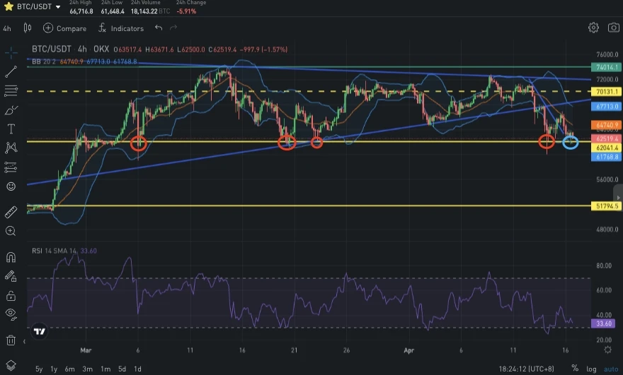 随着中东冲突的进一步升级和美国降息预期的一再推延,数字货币也在弥漫着避险情绪的市场中低位震荡,BTC 在香港批准 ETF 带来的短暂利好回升后再度下行,几度跌破重要的 62000 美元支撑位。