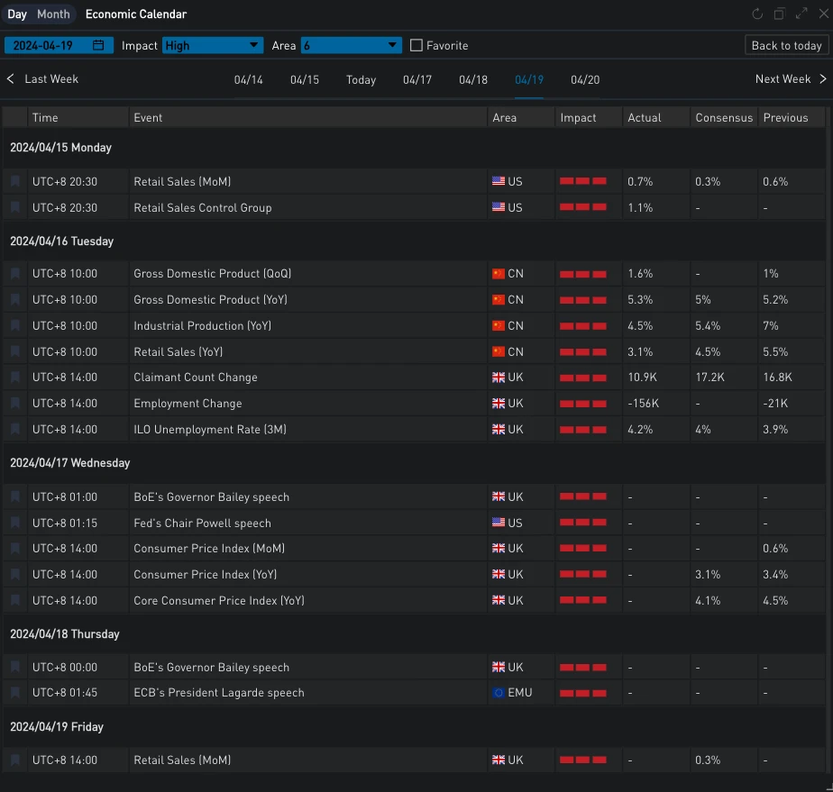 昨日(15 APR)美国零售数据表现强劲,月率环比增长 0.7% ,大超预期 0.4% ,前值也由 0.6% 上修至 0.9% ,市场对美联储降息的预期再一步推迟, 6 月和 8 月不降息的概率分别为 80% 和 54% ,美债收益率也逐步走高,两年/十年期收益率报 4.946% /4.655% 。美股承压下行,道指/标普/纳指分别收跌 0.65% /1.2% /1.79% 。
