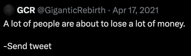 有趣的是,他还公布了自己之前的一个预测,即「如果你投入 20 个以太币到 SHIB,然后等待 5 个月到完全牛市顶峰,它可能会价值 4000 万」。到了 2021 年 5 月,事实证明,实际上交易者只需要在柴犬币(SHIB)中投资 2 个以太币,就能获得 4000 万美元的利润。这是 GCR 的第一个帖子,强调了他对迷因币(这种资产类别在 2021 年初尤其受到传统交易者的怀疑)的喜爱。
