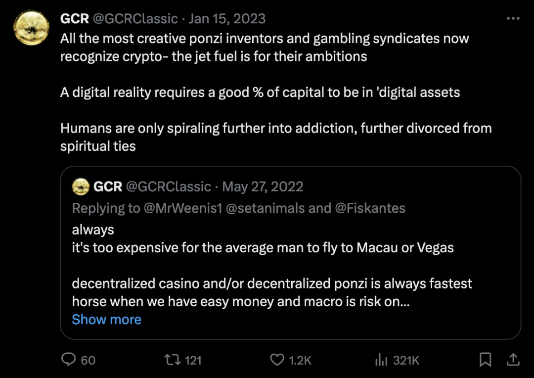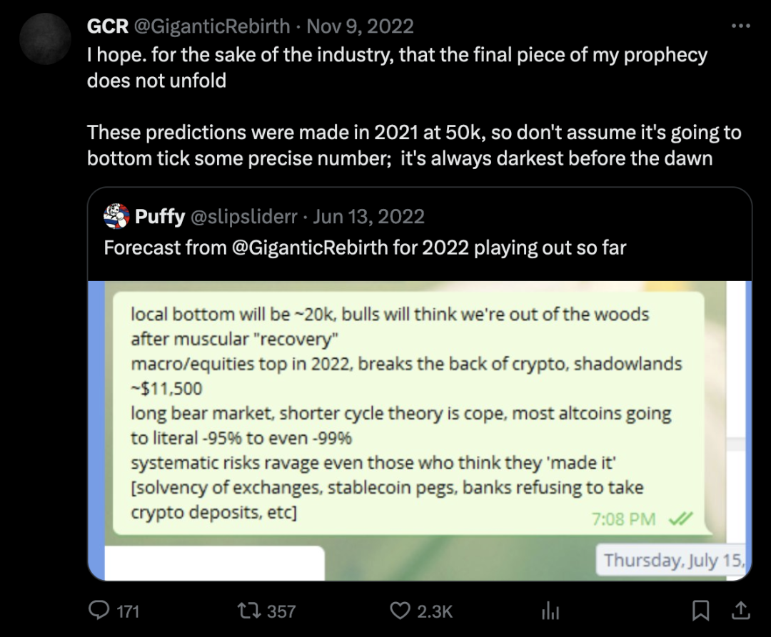 在 FTX 崩溃之后,GCR 永久停止了在@GiganticRebirth 账户上发布推文。他的备用账户@GCRClassic 提供了较少的个别交易更新,并给出了更一般的对未来的预测。