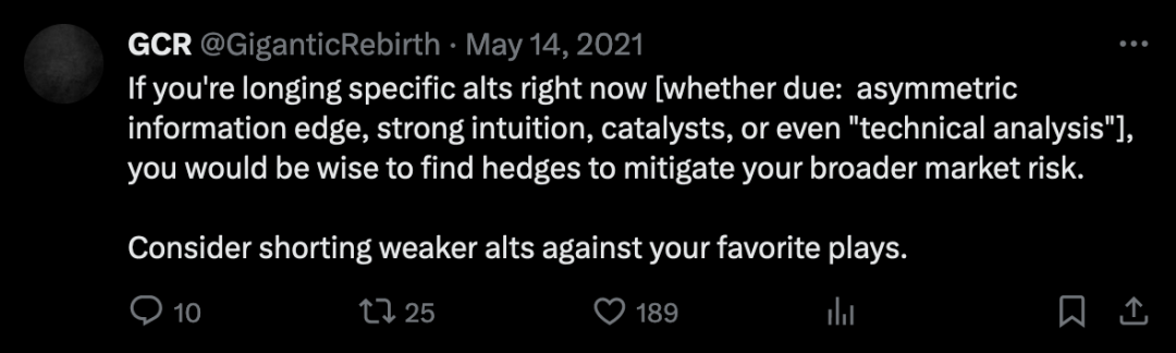 GCR 的看跌态度并不意味着他会离开 Crypto 市场——恰恰相反。尽管对 2021 年市场剩余的机会保持乐观,但他在 2021 年下半年的策略转向了利用市场流动性流出的空头头寸。从那时起,他大量做空相对于 BTC 弱势或强势的山寨币。