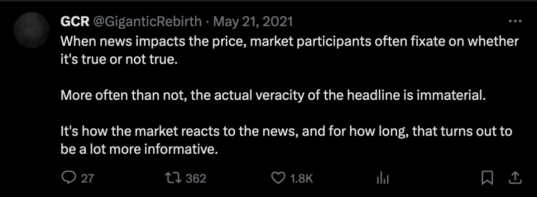GCR 本质上是一个逆向操作者——他在 2021 年的推文中经常提到一个「生命之树」,这是利用市场的关键。在许多不同交易者对 GCR 的秘密进行大量猜测之后,他最终暗示这个「生命之树」实际上只是愿意与共识观点对赌的一种意愿。他是乔治·索罗斯的忠实拥趸,并经常提及索罗斯的谈话要点,讨论反身性以及逆向思维的理念。