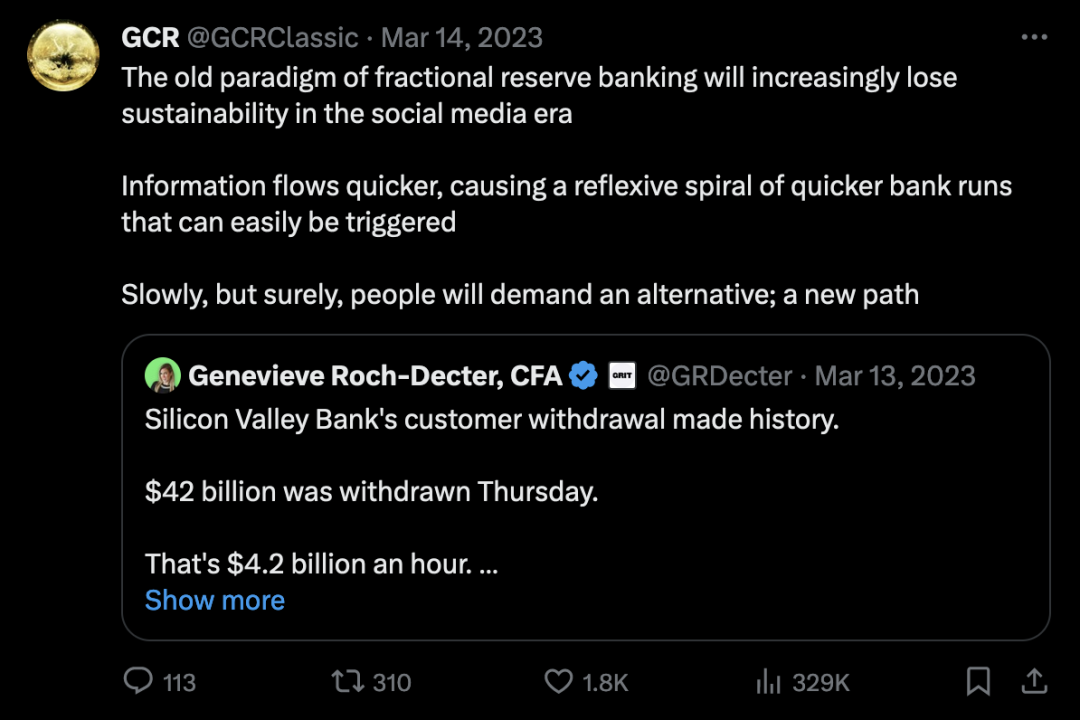 在推特上,GCR 表达了他的看法,他认为在数字化时代,Crypto 是必然会被广泛采用的。他说:「人们会寻求另一种选择,一条新的途径。」