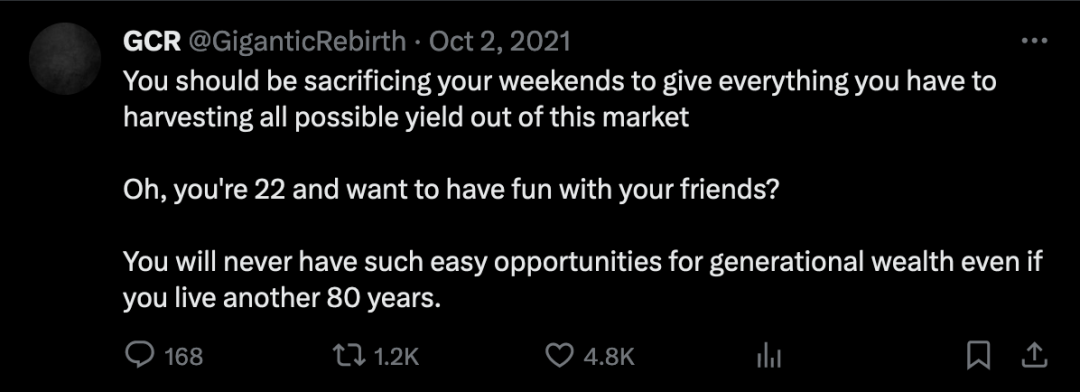 十月份,GCR 发布了他对年轻交易者的建议,要花时间在市场上寻找所有可能的优势。「即使你再活 80 年,也永远不会有如此容易获得世代财富的机会。」这种极度繁荣的状态大约持续了两个月——直到 2021 年 11 月底,Crypto 市场达到了历史最高点。