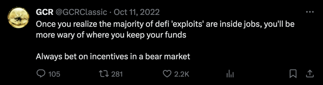 随着 2022 年熊市的持续,GCR 预见到会有越来越多的网络攻击、诈骗和欺诈事件,这些可能来自不法分子,也可能来自一些项目团队。因为越来越多的去中心化金融(DeFi)项目因为代码缺陷、被利用和重入攻击而受损,GCR 告诫交易者们,在熊市中,要特别关注激励机制,把它们作为投资决策的重要依据。
