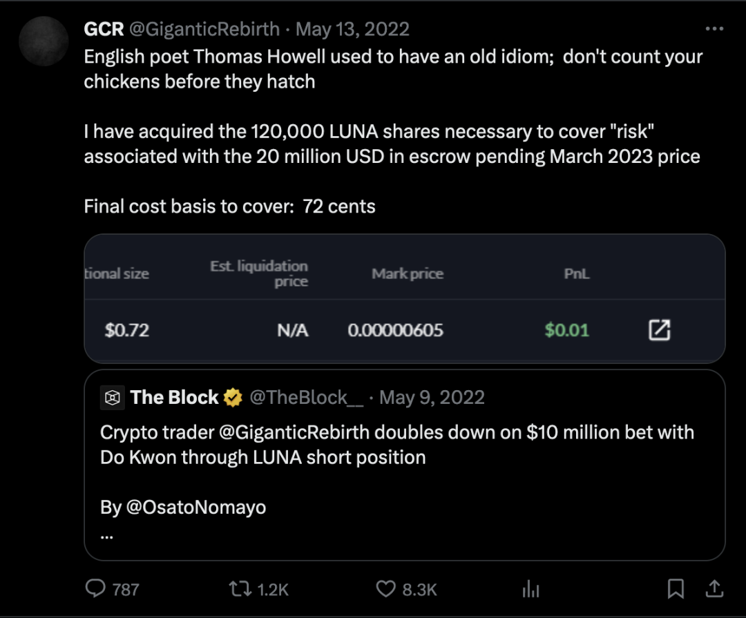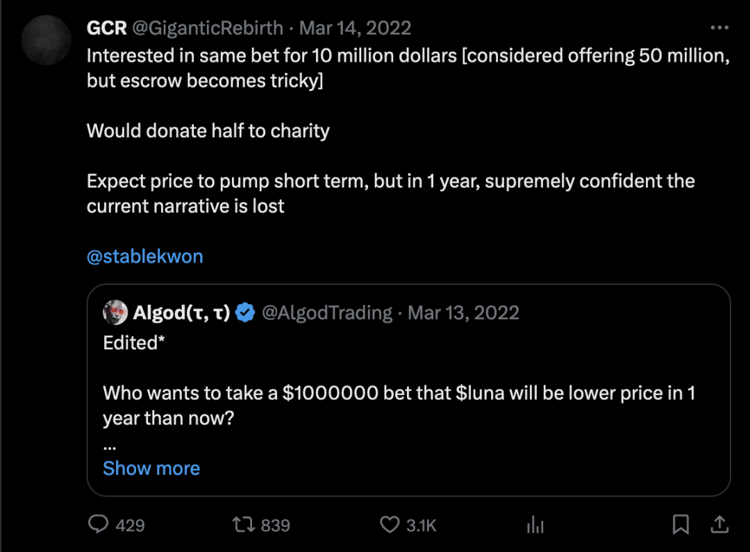 不过,GCR 最出名的一次操作是和 LUNA 的创始人 Do Kwon 公开对赌。2022 年 3 月 14 日,GCR 向 Do 提出了一个价值 1000 万美元的赌局,赌 Terra Luna 的价格一年后会比当时低。GCR 成功说服 Do Kwon 用他自己的 Crypto 赌上 1000 万美元,由一个叫做@cobie 的知名账户来管理这个赌局的托管。