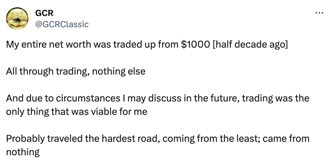 GCR 从未公开深入谈论过自己的背景,但偶尔会提及他来到 Crypto 世界之前的生活片段。在 X 平台上,他提到自己最初只有 1000 美元的投资组合,并表示这是他的「唯一机会」,并通过交易逐渐增加自己的资产。他通过政治影响分析首次展示了自己的预测能力,这是他在 X 平台上经常提及的一种实践。他还曾涉足体育博彩,并声称自己「可能花了上千个小时」研究如何延长寿命。