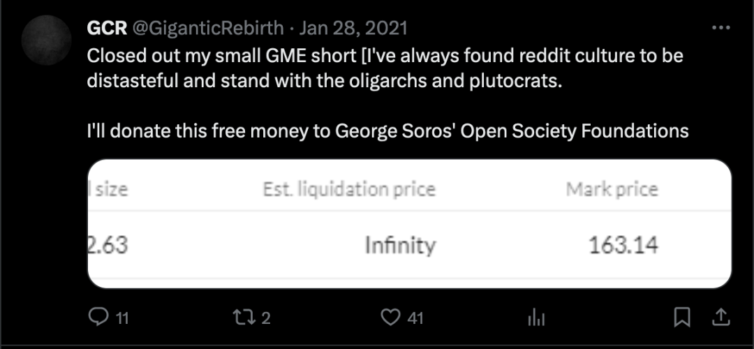 在 2021 年初,GCR 并不出名,在 Twitter 上也只有少量的关注者,他会在那里发布自己最近的市场情绪和交易活动的细节。从一开始,他就喜欢逆向观点,他最早的一篇帖子之一就是详细介绍了他在 2021 年 1 月做空由散户推动的 GME 股价上涨。他写道:「我一直觉得 Reddit 文化令人反感,我站在寡头和富豪这一边。」
