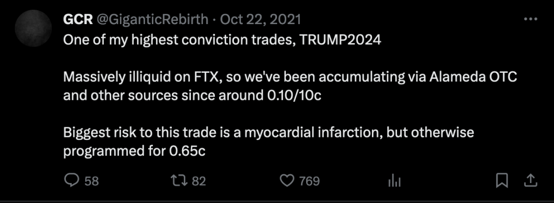 到 2021 年 10 月,他开始押注特朗普赢得 2024 年的选举。由于交易规模庞大,以至于在交易所上获得足够的流动性几乎是不可能的,他最终不得不求助于与 Alameda Research 进行直接的场外交易(OTC)。仅仅一年多之后,Alameda Research 的资产负债表被泄露,显示他们仍持有价值 730 万美元的未对冲的 TRUMPLOSE 代币——这可能是 GCR 交易的剩余部分。