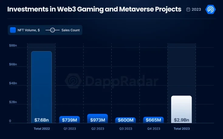 虽然在数据上有些出入,DappRadar 与区块链游戏联盟(BGA)联合发布的报告也显示出了一级市场在去年的低迷。该报告将专注于游戏领域并有意投资 Web3 游戏的 VC 所募集的资金也统计在内,据其统计, 2023 年共有 29 亿美元的资金流入 Web3 游戏和元宇宙行业,与 2022 年的 76 亿美元投资相比减少了 61% ,也低于 2021 年的 37 亿美元。