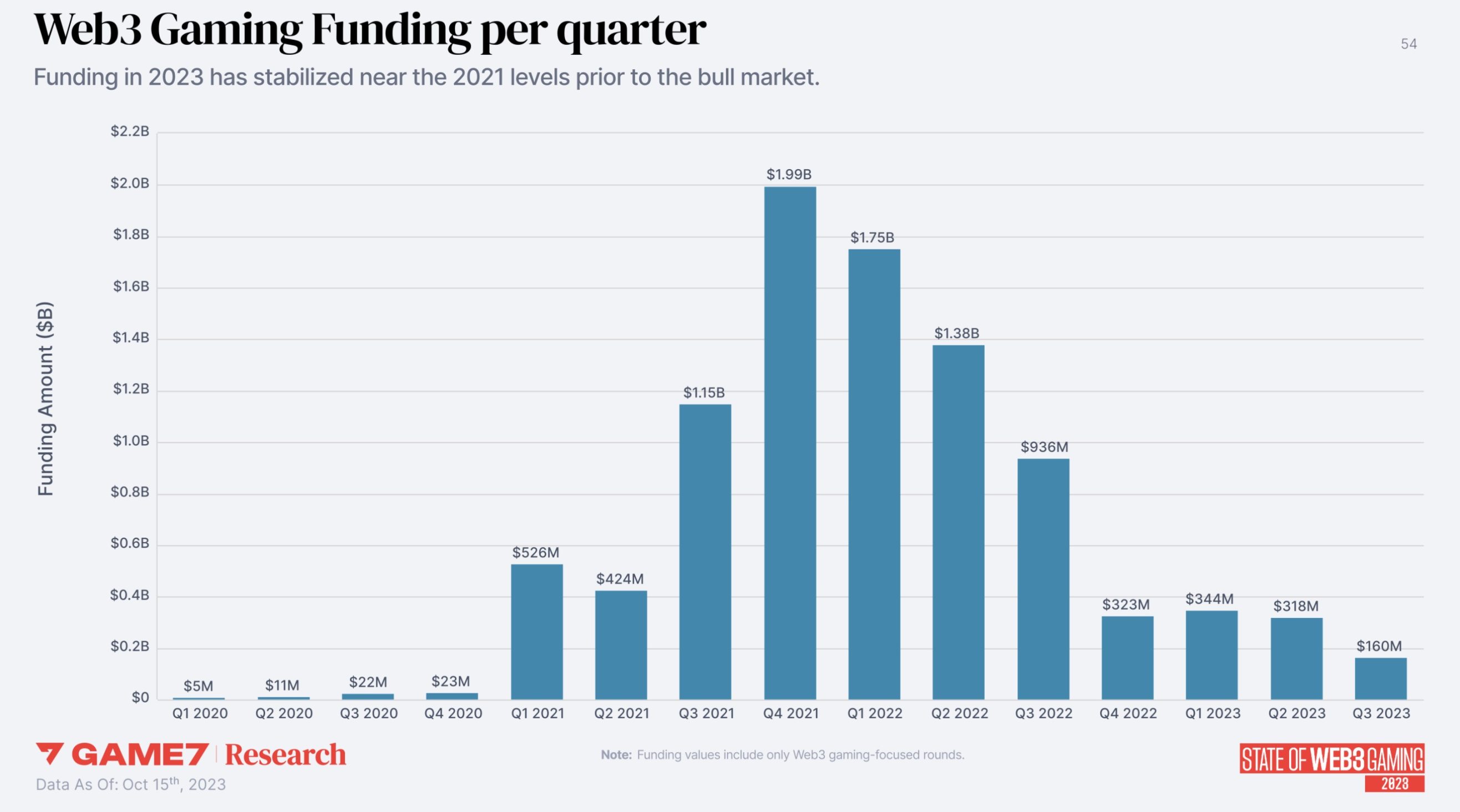 在整体游戏市场疲软,及加密市场处于寒冬的大背景下,Web3 游戏领域的投融资也在 2023 年呈现出显著的低迷。据专注链游的去中心化组织 game 7 统计,Web3 游戏行业在 2023 年前三个季度持续下行,从第一季度的 3.44 亿美元降至第三季度的 1.6 亿美元,单季度融资规模减半,已经稳定在低于 2021 年牛市前夕时的水平。