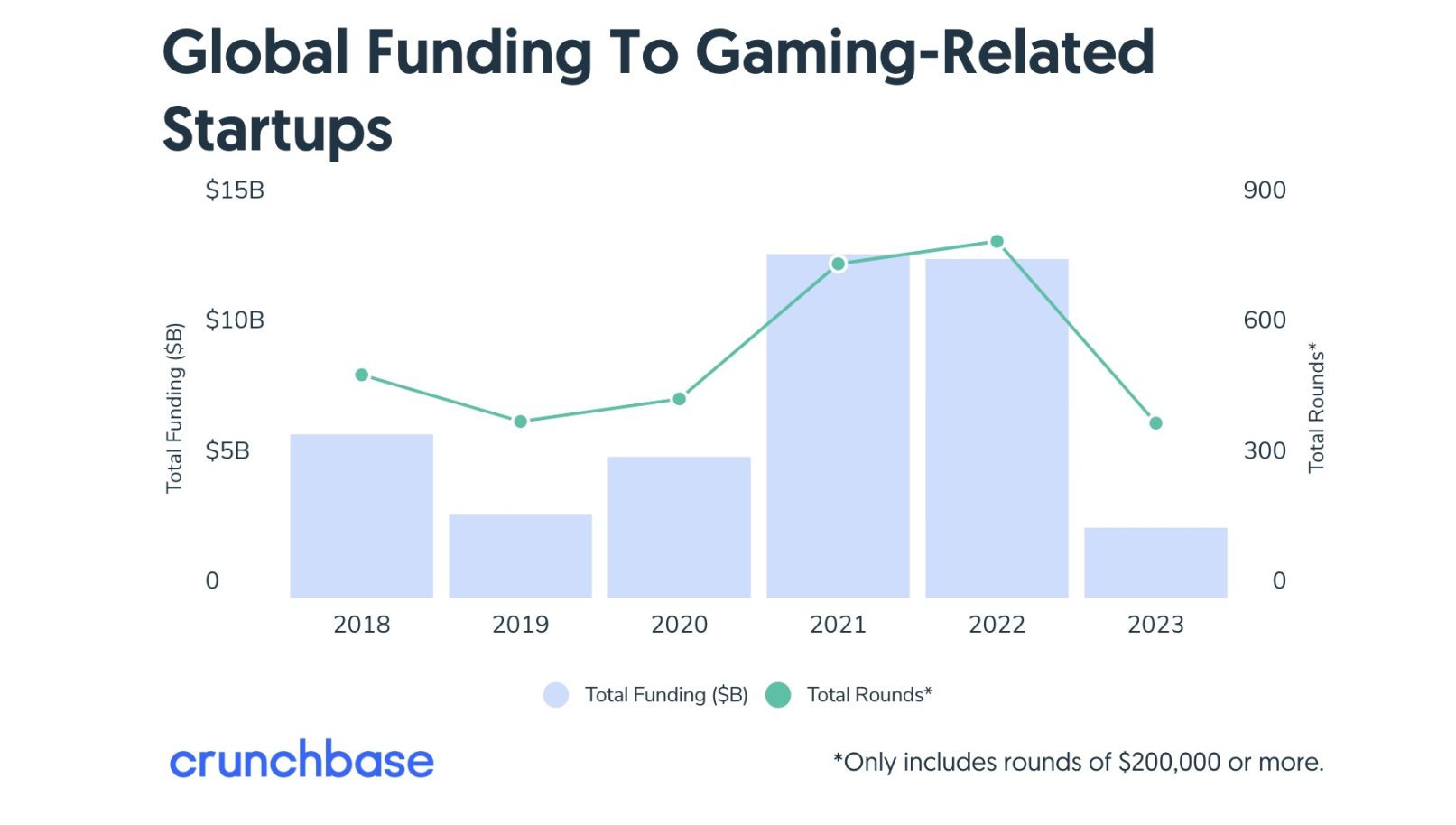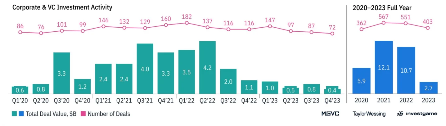 在具体数额上,据游戏投资数据分析公司 Investgame 统计, 2023 年风险投资和私人投资总计 27 亿美元,涉及 403 起融资事件。与 2022 年 107 亿美元的年度融资总额相比,大幅下降了 75% 。而值得注意的是,融资事件数量则并未减少那么多,「仅比」 551 起减少了 21% 。这让平均融资规模同比削减了三分之二,从 2022 年的 1940 万美元降至 2023 年的 670 万美元。InvestGame 将这种低迷的市场描述为对新冠疫情期间膨胀的融资活动的修正。行业的融资数量仍保持高于新冠疫情前的水平,但后期融资的数量较少,故无法提高资金总额。
