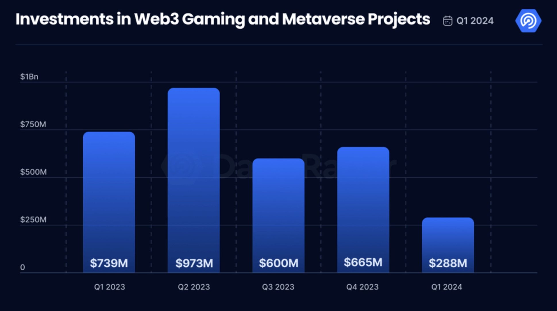 在刚刚过去的第一季度,随着加密货币的价格上涨,一级市场也逐渐回暖。据 PitchBook 统计, 2024 年第一季度加密货币和区块链领域共筹集了 25.2 亿美元的资金,环比增长 25% ,投资主要涉及 L1/L2、DeFi、AI、DePIN 和 Web3 游戏。然而据 DappRadar 与 BGA 联合发布的 2024 年第一季度区块链游戏报告显示,在 Web3 游戏这一垂直领域的相关投资实际上呈下降趋势。这一趋势是疫情期间元宇宙和游戏膨胀的投资热潮后的修正,不仅是 Web3 游戏,传统游戏行业一样如此。