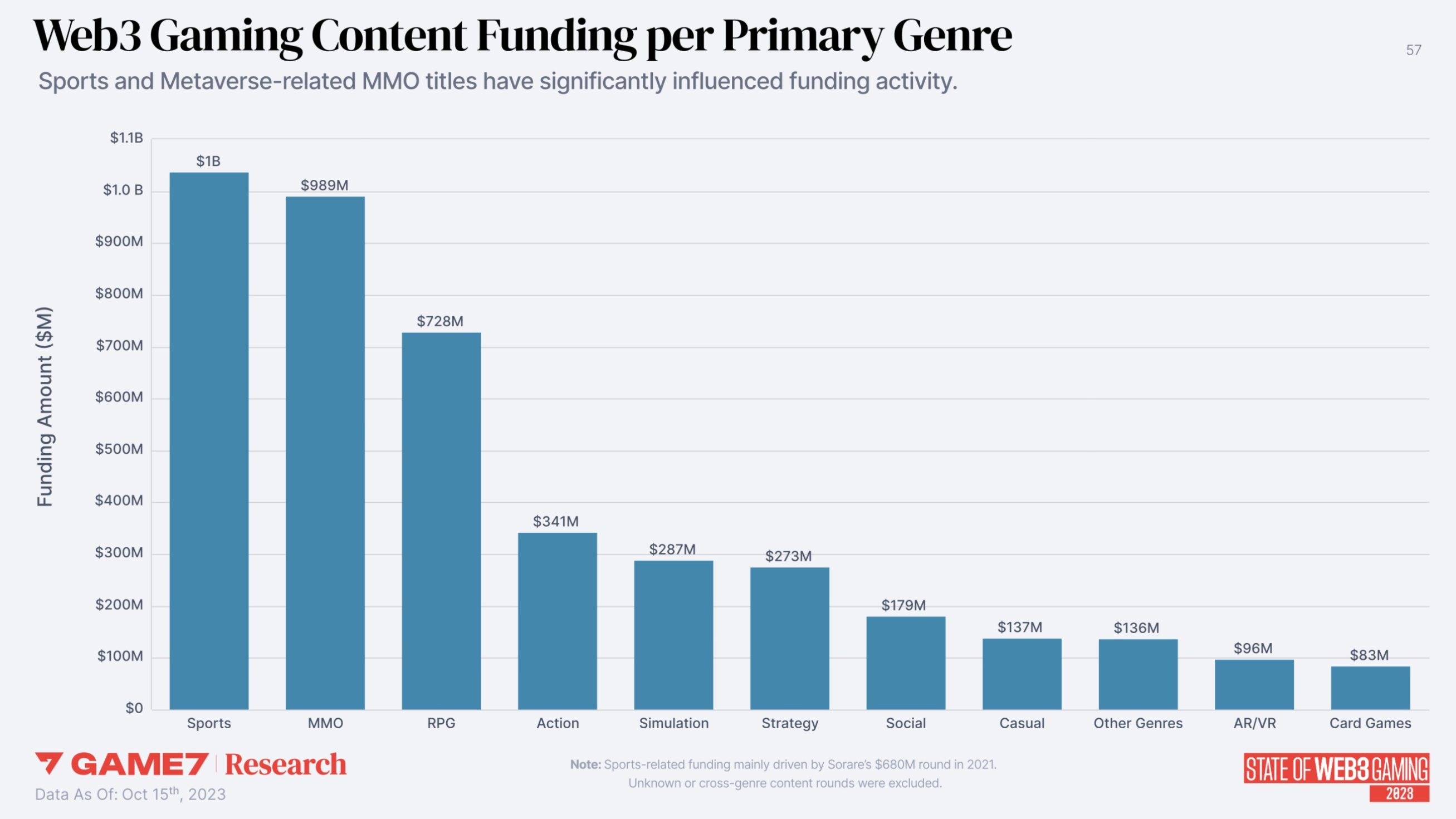 此外,game 7 对游戏类型进行划分后统计发现,近年来体育、MMO(大型多人在线游戏)、RPG(角色扮演游戏)的链游类型所筹得的资金量最多,分列前三名,大幅领先其他类别。需要指出的是,足球游戏 Sorare 于 2021 年以 43 亿美元估值完成 6.8 亿美元 B 轮融资,占同类别资金总量的近 70% 。此外动作、经营、策略类游戏也受到了市场的一定关注。