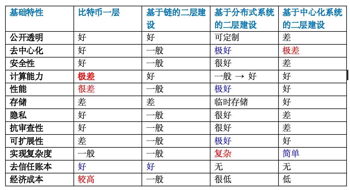 基于链的二层建设,是放弃了比特币一定程度的去中心化,从而达到其他性能指标的提高。基于分布式系统是通过增加实现复杂度,在二层保证比特币的去中心化同时,完成性能与功能的扩展。中心化系统是不改变比特币上资产的去中心化,只使用二层的统计或辅助功能,完成比特币一层的辅助管理。