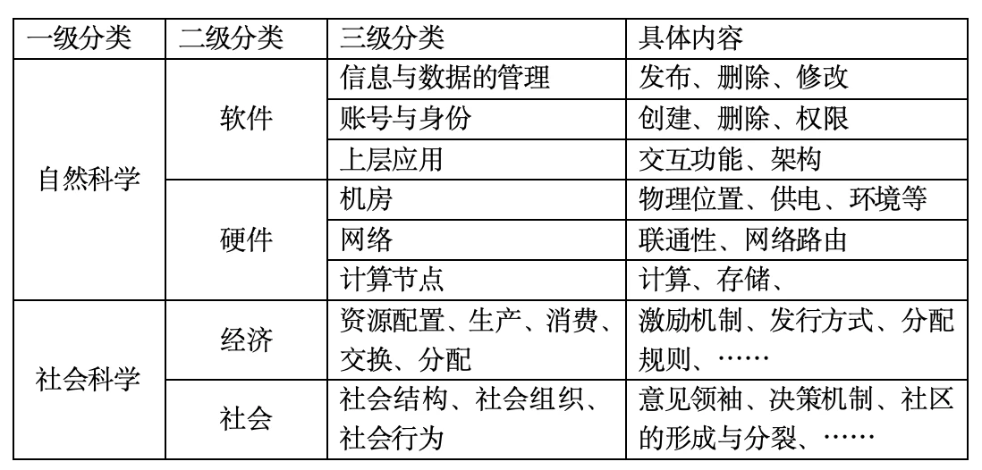 对于去中心化,还可以参考以太坊创始人 Vitalik Buterin 于 2017 年 2 月发表的文章“The meaning of decentralization”,文中详细阐述了去中心化的含义。Vitalik Buterin 认为应该从三个角度来区分计算机软件的中心化和去中心化,这三个角度分别是 架构、治理和逻辑 。架构中心化是指系统容忍多少节点的崩溃并可以继续运行;治理中心化是指需要多少个人或组织能最终控制这个系统;逻辑中心化是指系统呈现的接口和数据是否像是一个单一的整体。架构和逻辑是不是自然科学层面的中心化与去空心化分析?治理是不是社会学层面的分析?