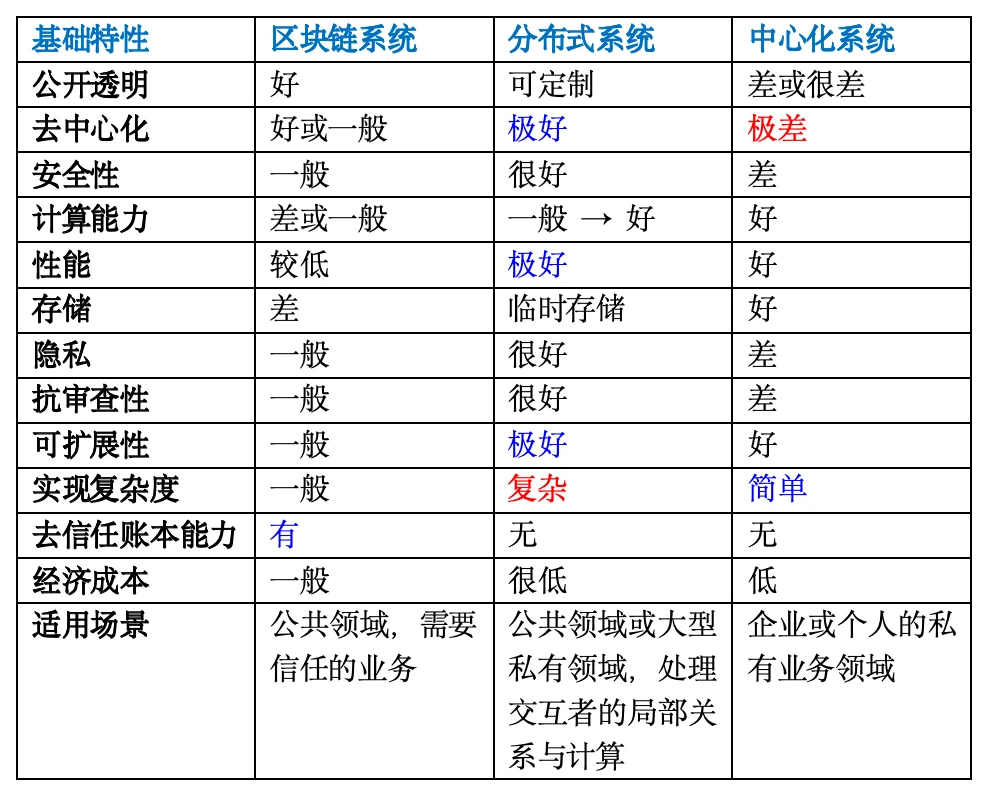 根据我整理比特币二层建设相关资料时候的总结(见参考文献),我们对比一下区块链系统(去中心化)、分布式系统、中心化系统三者的主要特点。这些特点有可能会有理解上的争议和总结的不准确,我们只需要关注里面的显著差异,如去信任账本能力。