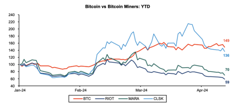 或许也正因为不确定性,在减半前,头部上市矿企股票均已迎来大跌。Marathon Digital Holdings、Riot Platforms以及CleanSpark的股价已连续三天下跌。最大的公开比特币矿商Marathon Digital Holdings的股价在过去一个月下跌了近25%,而Riot Platforms则下跌了近30%。Valkyrie 比特币矿工交易所交易基金本月价值下跌约28%。